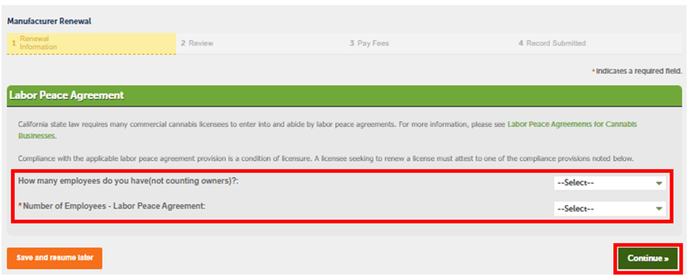 Select your answer to the questions below regarding number of employees. Depending on what you select, you will need to provide either a form DCC 9205 labor peace agreement notarized statement or a copy of the signature page of your LPA when you reach the document upload screen. In addition, you will need to provide the Labor Organization name and the LPA expiration date.