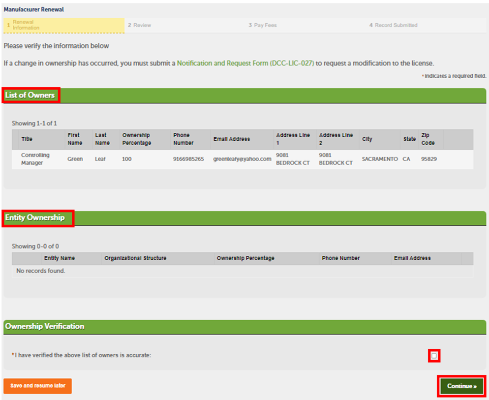 To begin, verify that the List of Owners and Entity Ownership is current. If the list of owners is not accurate, the licensee must report the ownership updates using form DCC LIC 027 and submit to licensechange@cannabis.ca.gov.