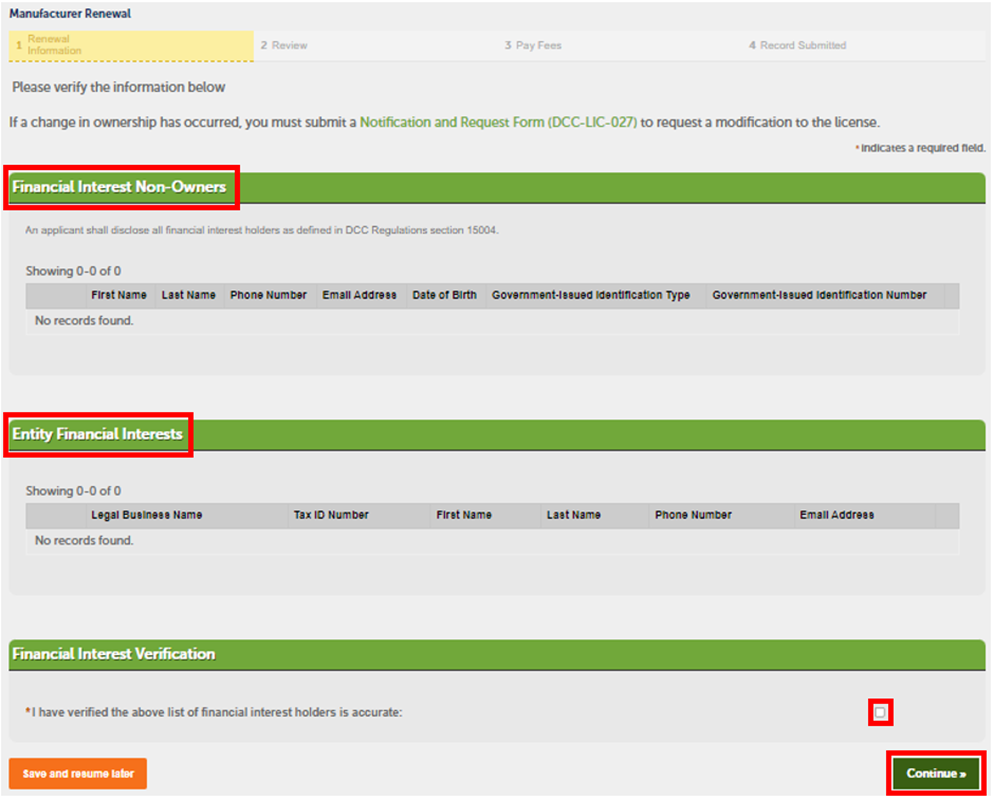 Verify Financial Interest Non-Owners and the Entity Financial Interests is current. If the list of Financial Interest Holders is not accurate, the licensee must report the changes using form DCC LIC 027 and submit to licensechange@cannabis.ca.gov.