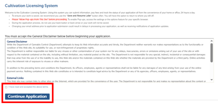 The first step is to review the General Disclaimer statement. Check the box to accept the terms of use for the website.