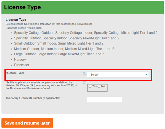 Select the License Type for your business. There are 22 license types that you can apply for, which are listed below. These types combine the size of your site and the cultivation method.