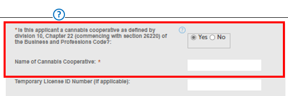 Check Yes or No to indicate whether your business is part of a cooperative. Use the Help function to see the legal definition of a cooperative, per Business and Professions Code Chapter 22. Checking Yes displays another field to enter the name of your cooperative.