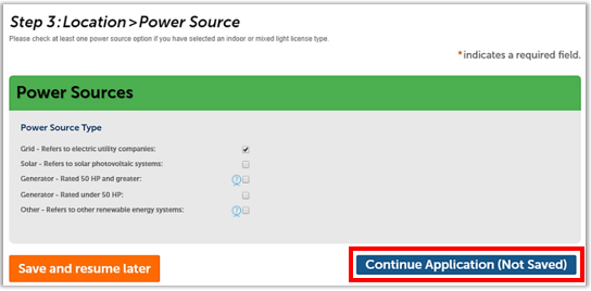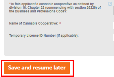 From this point on, you can click the Save and resume later button to save your work. If you need to step away from your computer, do this before your session times out (1 hour) to avoid losing work. The application will be waiting in your My Licenses list, and you can click Resume Application to continue.