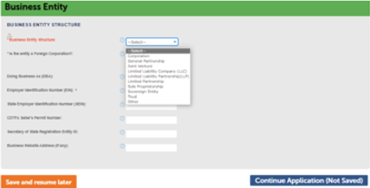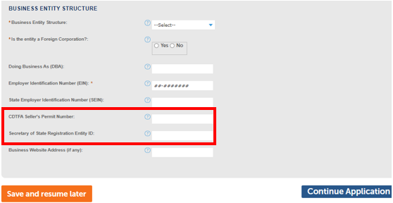 The Seller’s Permit Number from the California Department of Tax and Fee Administration (CDTFA) and the Secretary of State Registration Entity ID are optional.