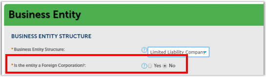 Indicate whether your business is a Foreign Corporation. Checking Yes will require documentation later.
