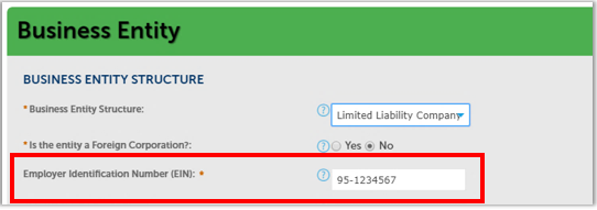 Enter your Employer Identification Number (EIN). If you chose Sole Proprietorship as your Business Entity Structure, a field for your Social Security Number or ITIN also displays, should you wish to report income through either of those numbers.