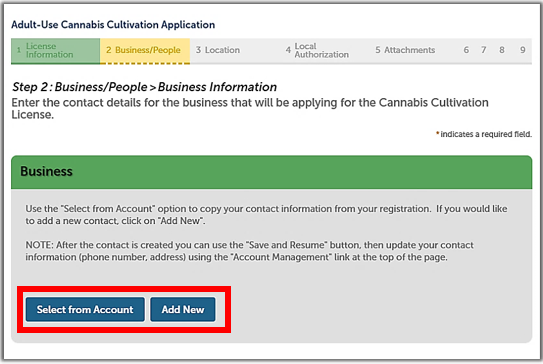 The Business section asks for the applicant’s contact and address information. Click Select from Account to get this information from your own CLS account or click Add New to enter another person’s contact information.
