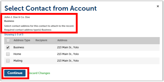 A pop-up window opens, prepopulated with the contact information from your account, including the pre-selected Business address type.