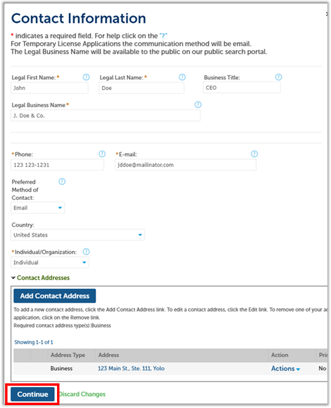 Click Continue to save this business contact information to your application.