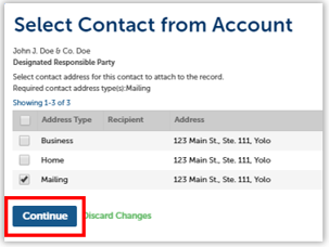 Choose the Business address type. If you created one when you registered, it will be preselected. Then, click Continue.