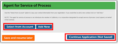 If you plan to add an Agent for Service of Process, you can click Select from Account or Add New to enter a different individual. The required information for adding or changing an ASOP is full legal name, mailing address, phone number, email address, and preferred method of written communication (e.g., standard mail or email).