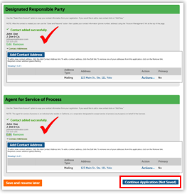 When you have saved contact information for both roles on this page, click Continue Application.