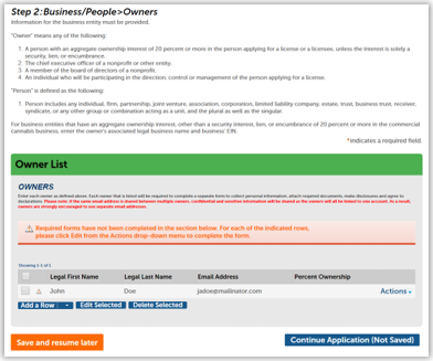 In this section, create a list of owners of the cannabis business entity. An “Owner” is any of the following: