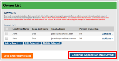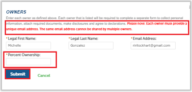 Enter each owner’s legal first and last name (case sensitive for users who already have accounts) and email address and percentage of ownership in the pop-up window. Click Submit to save each Owner entry.