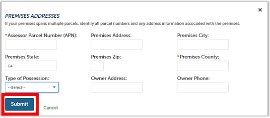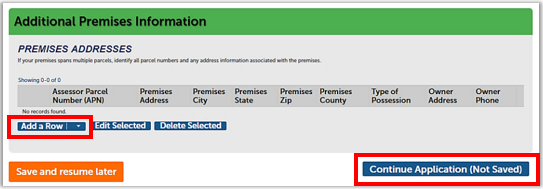 Click Add a Row to enter other premises parcel numbers or addresses in the pop-up window, as you did in the Premises Information section. Then, click Submit to save to the Additional Premises table.