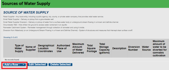 Click Add a Row. The pop-up window asks you to choose a Type of Water Supply. The window then displays only the fields needed for that type of supply. Click Submit when finished.
