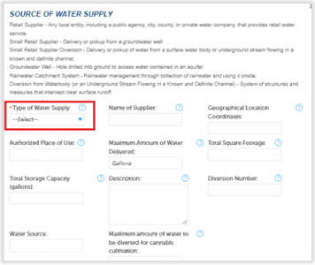 A source of water supply is required for all license types. You can list multiple water sources of different types.