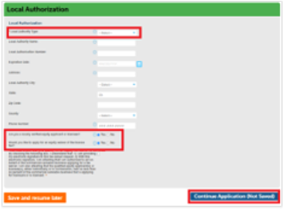 Depending on your choice, enter the Local Authority Name (for County) or Local Authority City. The other fields are optional, but if you have it, providing this information will help with processing your application.