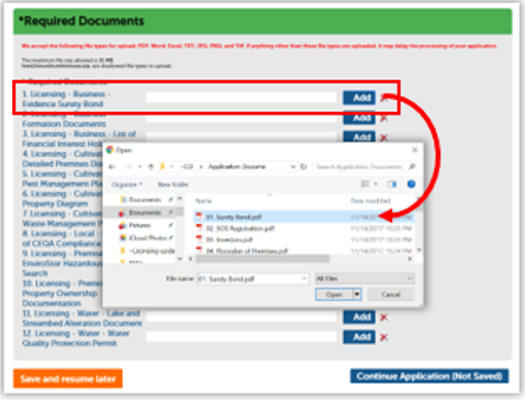 In the Required Documents section, click the Add button to open a Windows Explorer dialog. Find the file associated with each item in the list.