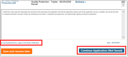 At the bottom of the page is an attestation statement, click the checkbox to certify your application, which automatically enters the date, then click Continue Application.