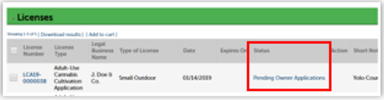 Note: At this point the main application is submitted and appears in your Licenses list with the Status Pending Owner Applications.