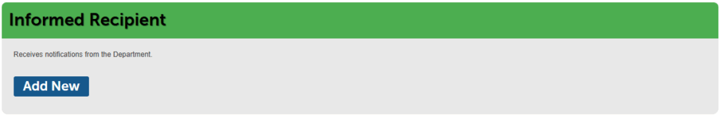 If you plan to add an Informed Recipient, you can click Add New to enter the individual’s contact information. The required information for the Informed Recipient is First Name, Last Name and Email Address.