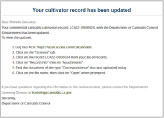 After the Declaration and Final Affidavit is submitted, the system sends an email to the DRP and displays an announcement with information to log in, find the application record, then open the attachments section found in the Record Info tab.