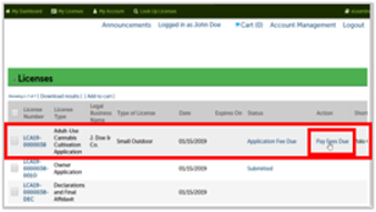 The Status of your license application is now Application Fee Due, and the Action listed is Pay Fees Due – click on that link to begin the payment process.