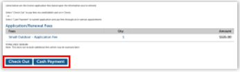 On the next page, your application fee is listed. You can choose Check Out to pay online, using either a credit card or bank transfer.