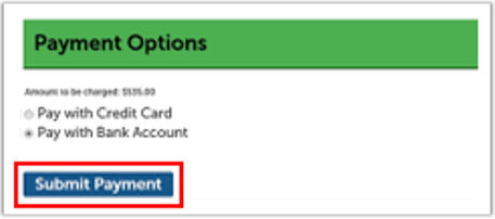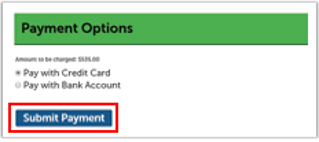 On the Payment Options screen, choose whether to pay by credit card or bank account. Then click Submit Payment.