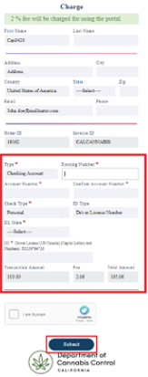 Enter the routing number, then the bank account number, re-enter the bank account number. Enter Driver License or SSN information. Click Submit.