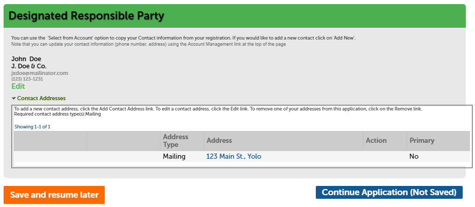 Below the Attachment section is the Designated Responsible Party section with your personal information (assuming this deficiency notification was sent to you as the DRP for the business). Do not change anything in this section. Click Continue Application.