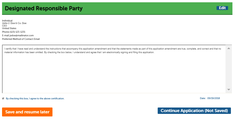 The next screen lets you review your entries and asks you to certify your response. Click the checkbox, then Continue Application.