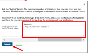 Use the Resolution text box to explain that the requested item is attached. For example: “Requested document is attached.” Then click Submit.
