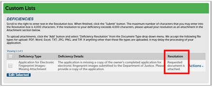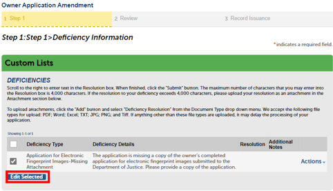 Any deficiencies found in the Owner application are listed in the first section. To respond, click the checkbox next to the deficiency and then Edit Selected, or choose Actions/Edit. One of the most common deficiencies is for the Electronic Fingerprint Application, shown here. There may be other deficiencies, including government ID or information related to convictions.