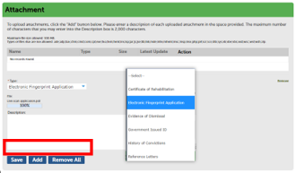 The pop-up window closes, and the Attachment section shows one or more files recently uploaded. Identify each file by using the Type dropdown list to select a category.