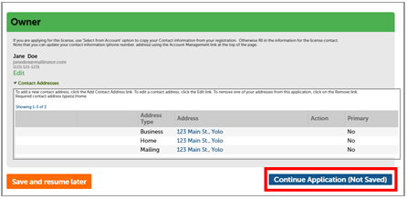 In the Owner section, your contact information is displayed. Do not change anything in this section. Click Continue Application.