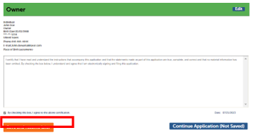 In the Review section, check over your Owner Application Amendment before submitting it. At the bottom of the screen, Check box to certify, then click Continue Application. Your Owner Application Amendment is submitted.
