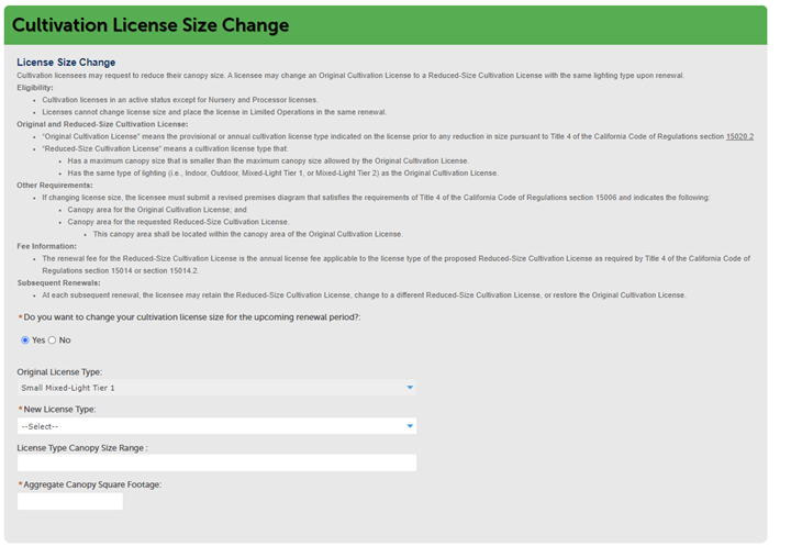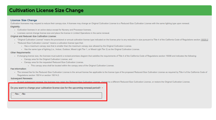The Department of Cannabis Control (DCC) adopted regulations in CCR, title 4, sections 15020.1, 15020.2, 15020.3 to implement Senate Bill 833. Under the regulations, eligible, active cultivation licensees can make certain changes to their license. Learn more about making these changes during renewal through the licensing system.