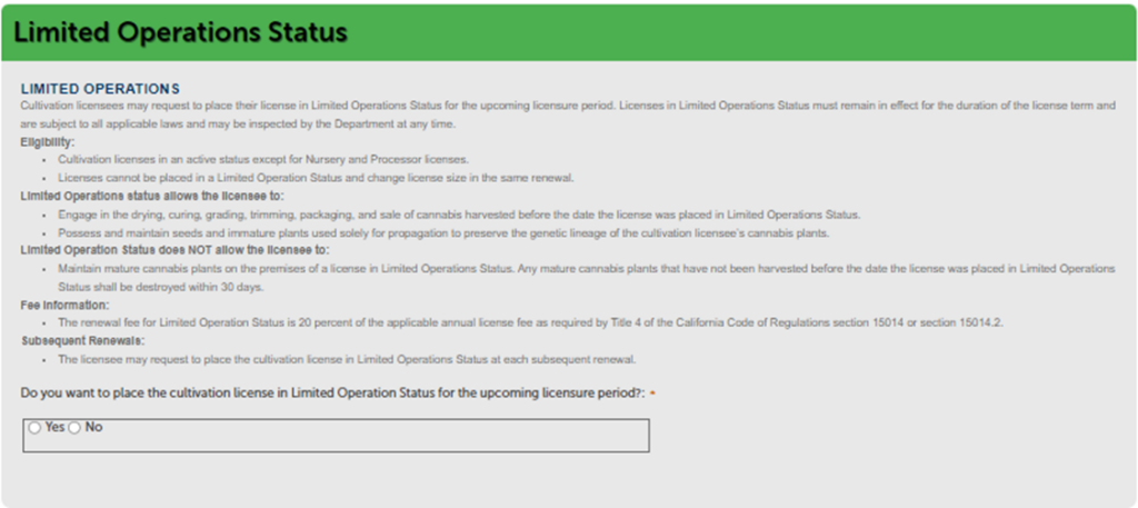 To place your license in a Limited Operations Status, select the “Yes” button.