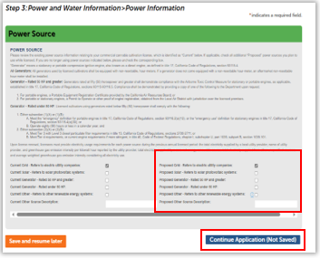 This section is for your Power Source. Your current selection(s) are repeated on the righthand, “proposed” side of the screen. Make any changes to the righthand side of the screen by selecting or deselecting the appropriate checkboxes. Select Continue Application to move on to the next page.