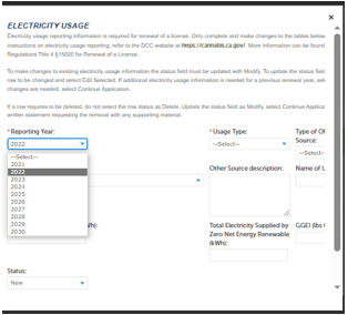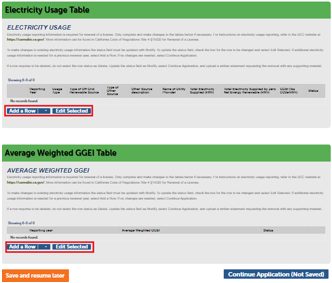 Enter the Electricity Usage information for the previous licensed period. To begin, click Add a Row.
