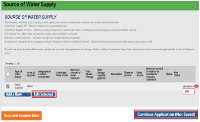 This section identifies your Source of Water Supply. This is the same information recorded on your current license. This section can be used to edit, add, and delete rows. To edit a row, select the checkbox next to one of your sources and select Edit Selected. Additionally, you can select Actions and Edit from the row you would like to change.
