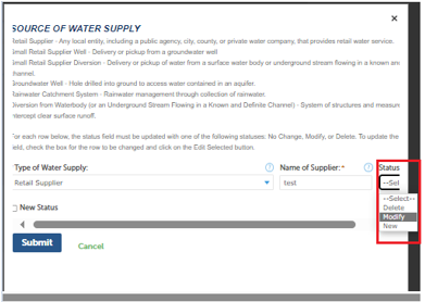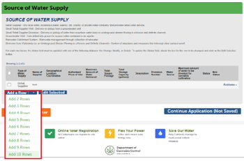 To add a new source of water supply, select Add a Row. You can add up to 10 Rows at a time.