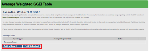 Enter the Average Weighted GGEI information for the previous licensed period. To begin, click Add a Row. If a change in a prior renewal year is needed, select the checkbox next to the appropriate reporting year and select Edit Selected or select Actions and Edit. If reporting for a previous year that has not been recorded, select Add a Row. A new window will open.