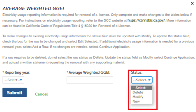 Note: To make changes to existing electricity usage information the status field must be updated with Modify. If a row requires to be deleted, do not select the row status as Delete. Update the status field as Modify and upload a written statement requesting the removal with any supporting documents.