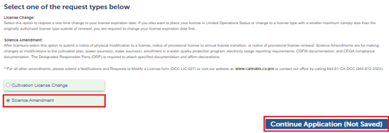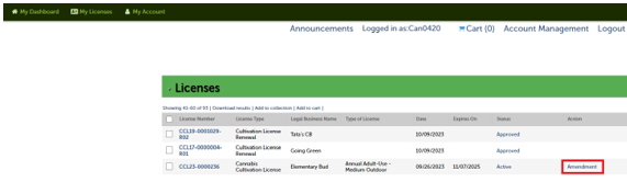 All active license records listed on your Licenses page now have an Action link for Amendment. This is one route for submitting a Science Amendment. Select the Amendment link to begin.