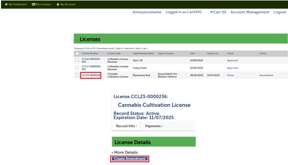An alternative method for creating a Science Amendment is to select the License Number to open the record, then select the Create Amendment button.