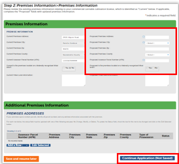 In this next step you can make changes to your Premises address, by entering new values in fields on the right side of the screen. You can make corrections to address information or your Assessor Parcel Number (APN).