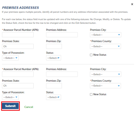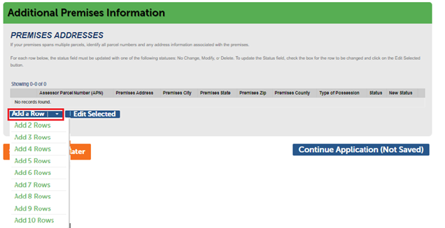 The Additional Premises Information is the same information recorded on your current license. This table can be used to edit, add, and delete rows. To edit a row, select the checkbox next to one of the APNs and select Edit Selected. Additionally, you can select Actions and Edit from the row you would like to change.